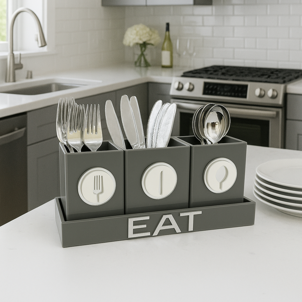 This sleek caddy features three compartment cups, each adorned with charming fork, knife, and spoon decals. Resting on a tray with the word "EAT" in mirror acrylic, this set adds a touch of elegance to any table. Available in a variety of colors, it's perfect for parties and everyday use alike. Organize your flatware in style and make every meal a delightful experience!